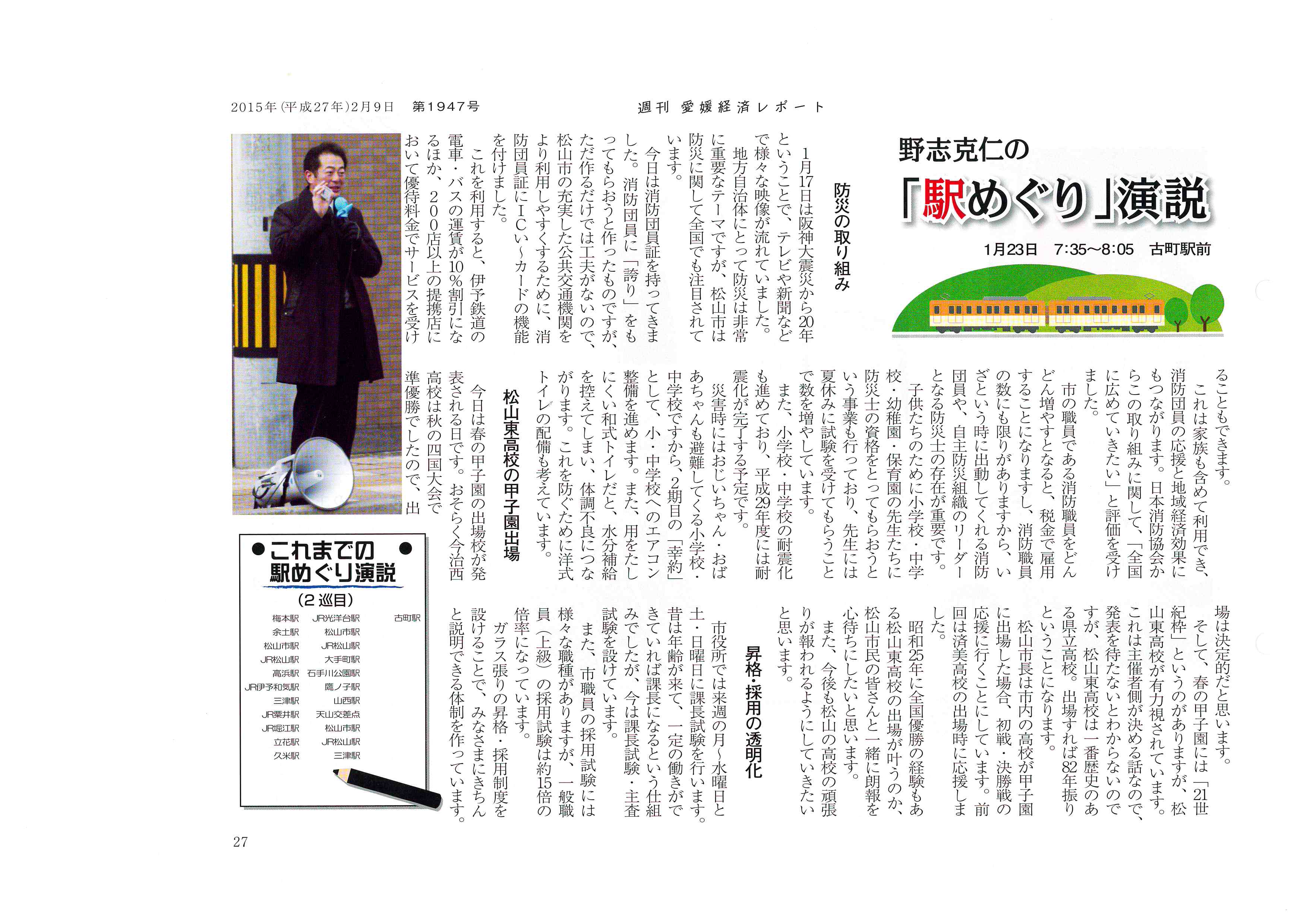 週刊 愛媛経済レポート2月9日号に、野志克仁「駅めぐり」街頭演説の内容が掲載されています。(1月23日、古町駅)