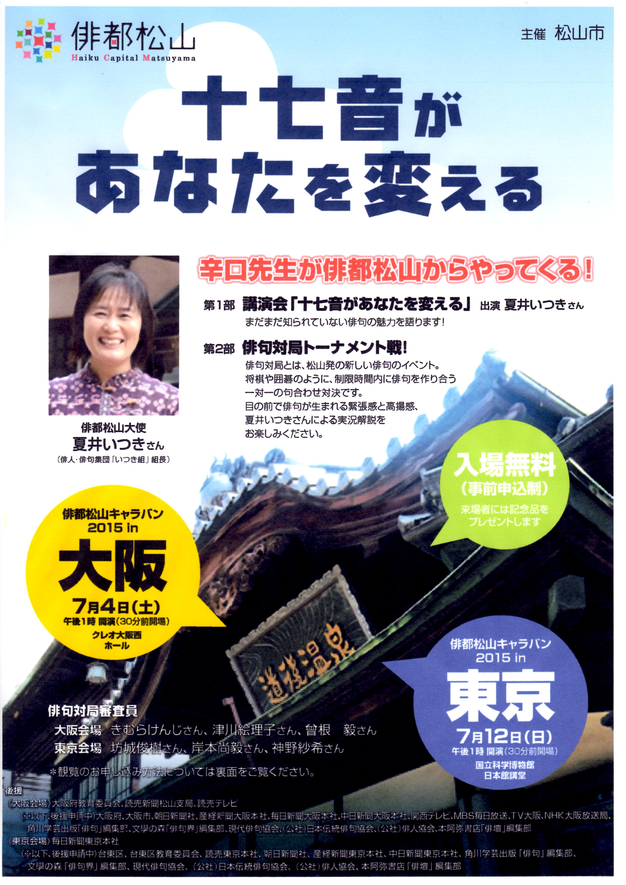 平成29年度は、正岡子規・夏目漱石生誕150周年、俳句甲子園第20回大会、坂の上の雲ミュージアム開館10周年という節目を迎えますので、これを機に「俳都松山大使」に任命した「夏井いつき」さんと共に、「ことば」を松山のブランドとして発信し、「ことばのちから」によって、幸せ実感できる松山を目指します。