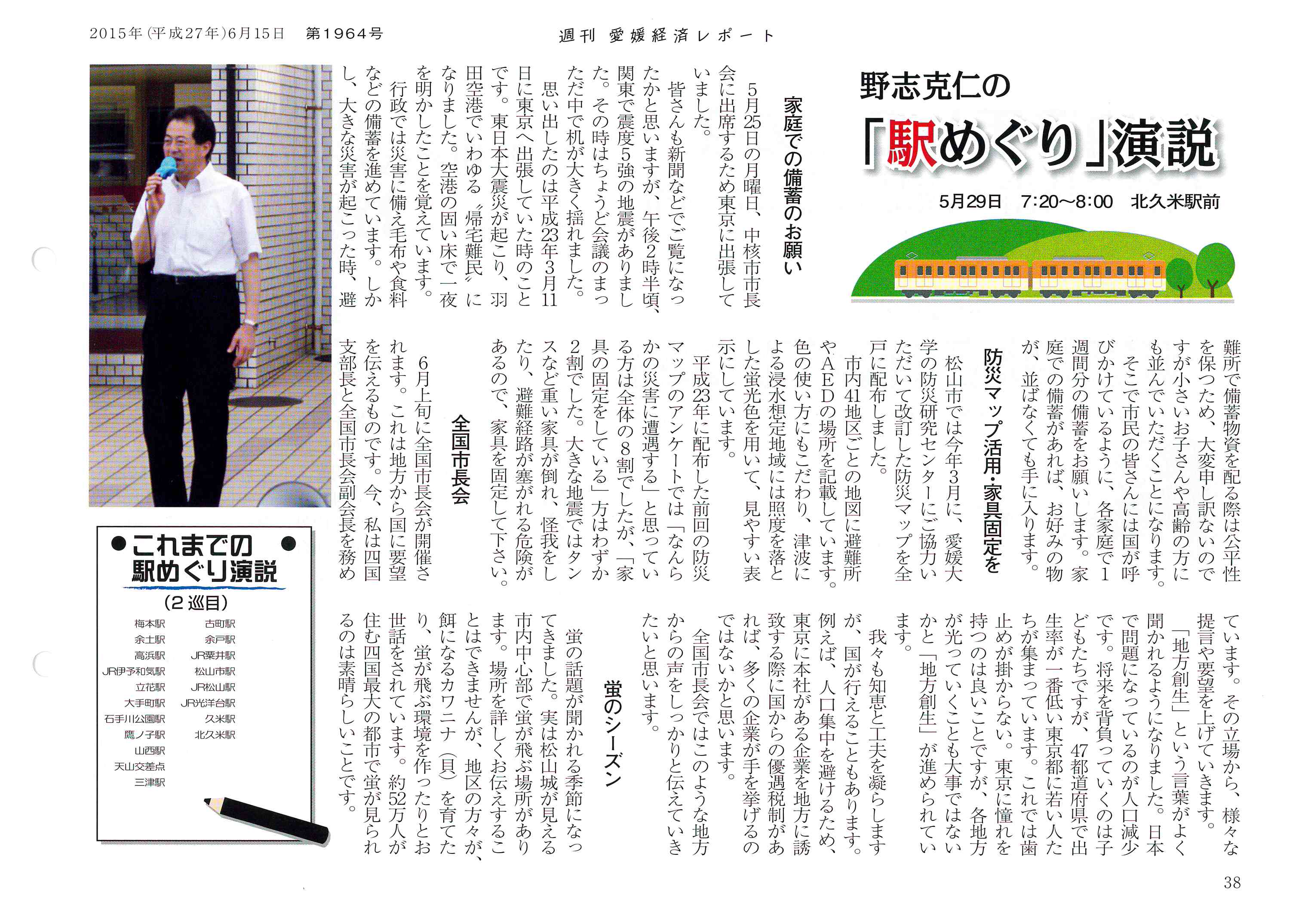 週刊 愛媛経済レポート6月15日号に、野志克仁「駅めぐり」街頭演説の内容が掲載されています。(5月29日、北久米駅)